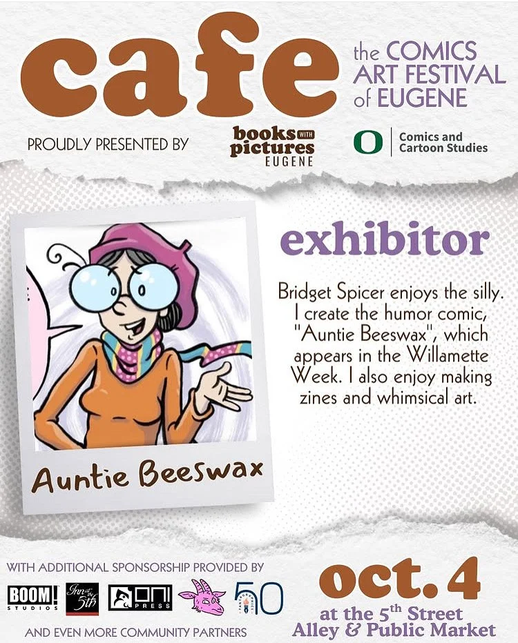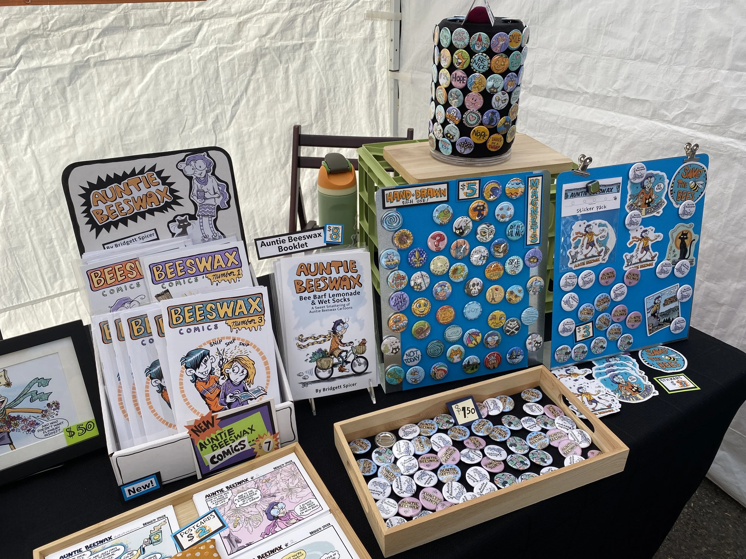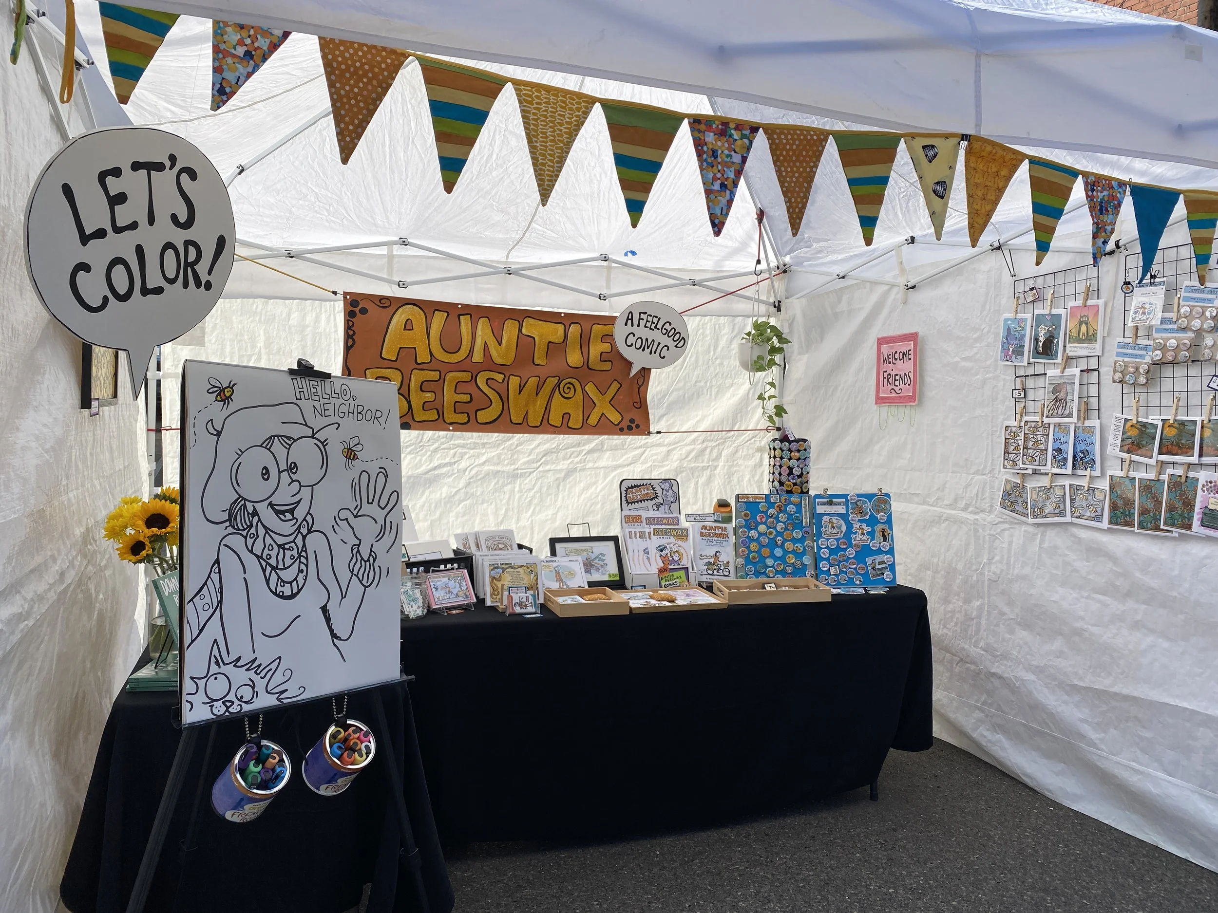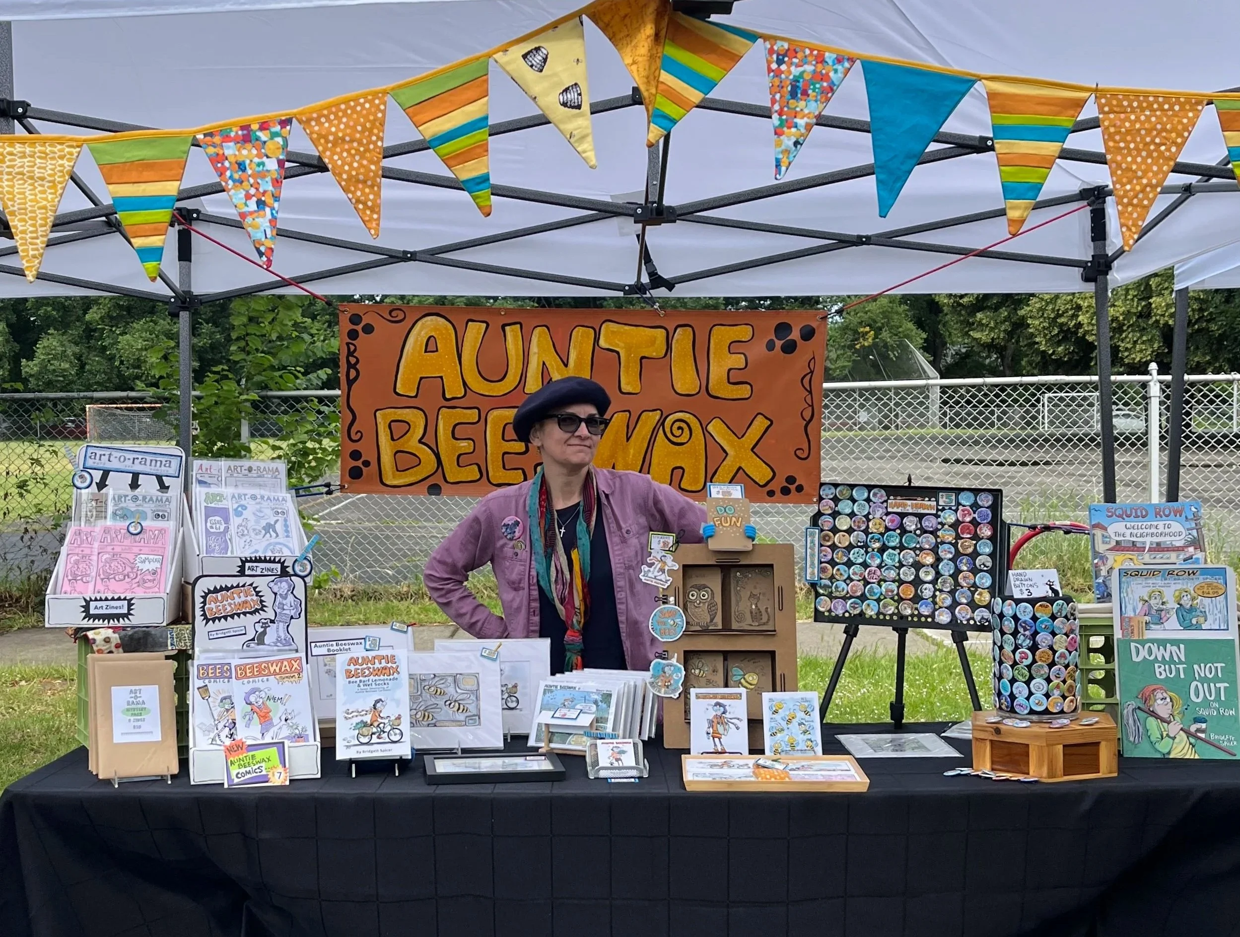 Art in the park… come support local artists while enjoying an afternoon in a beautiful park. There’ll be dozens of local creators… and I’ll have my table with Auntie Beeswax goodies, like comics, buttons, magnets, art and more! Come Join in on the Fun!