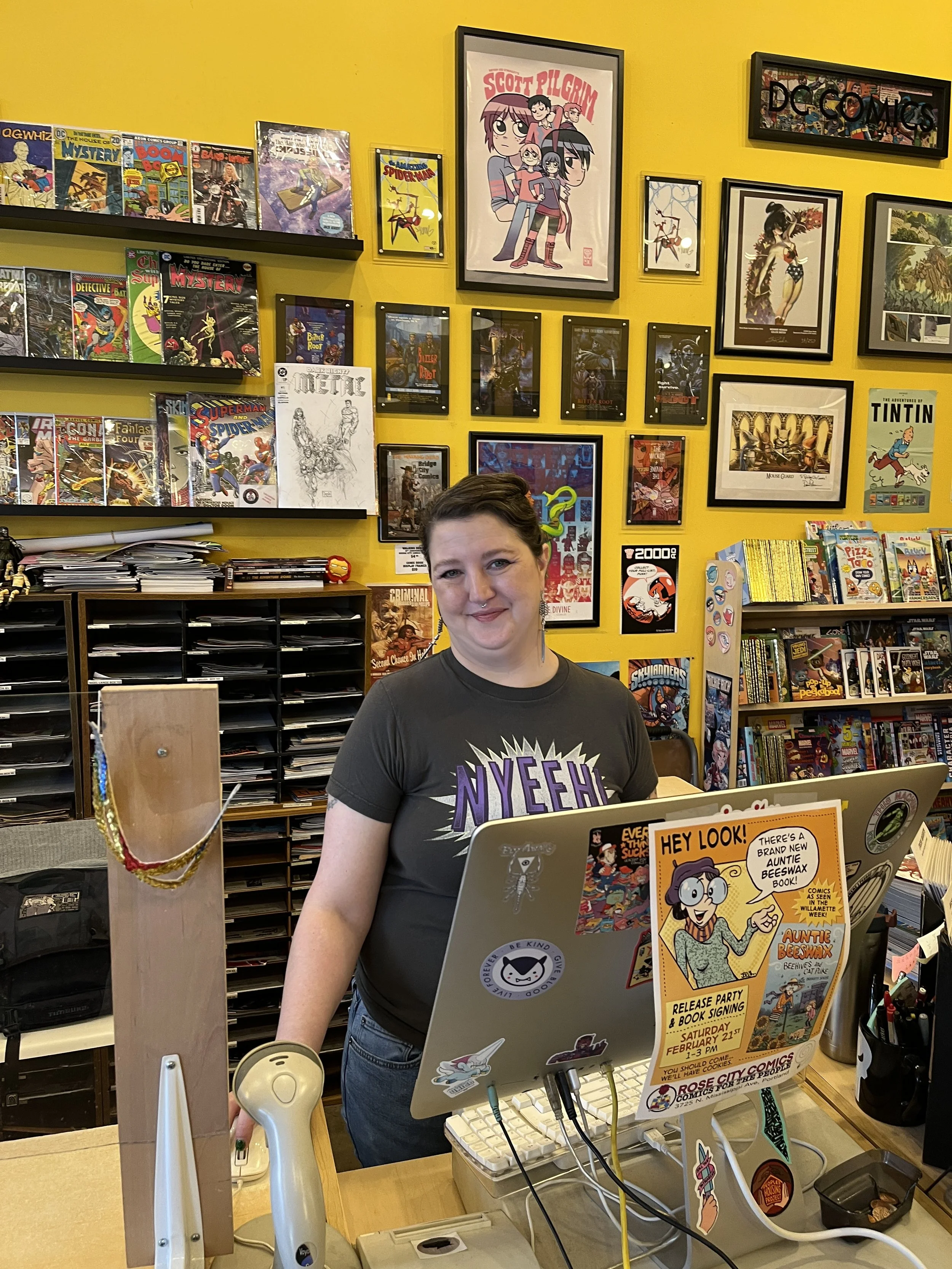 Auntie Beeswax and 6 other cartoonists (and a clown… or should I say, the YULE CAT) will be at Eris with tables full of cartoons, books, original art and other really cool stuff!
